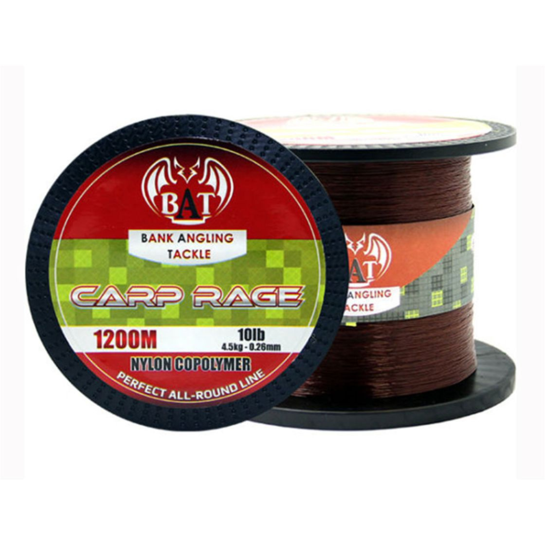 BAT carp rage line is available in 1200m spools. The brown colour has a purple tinge to allow it to blend with most bottom conditions.