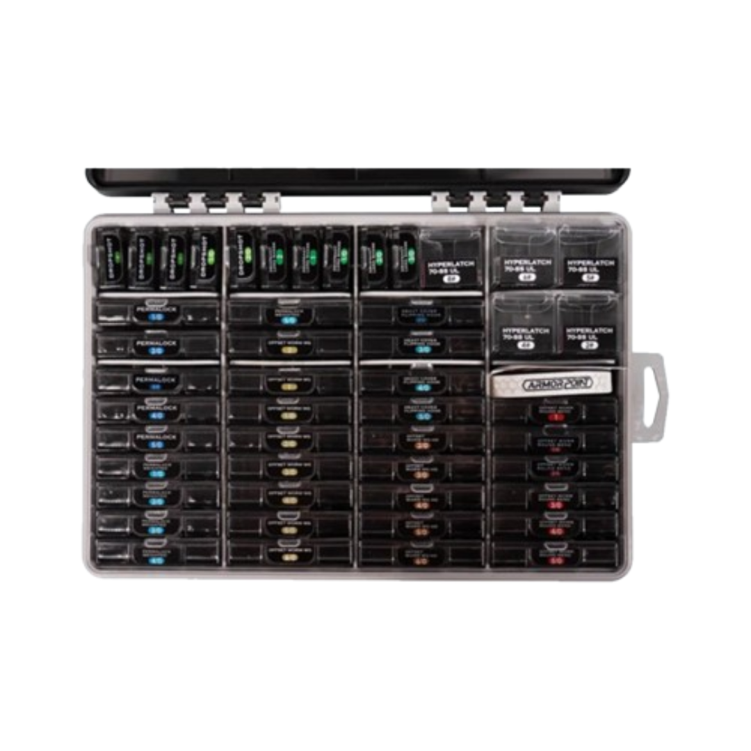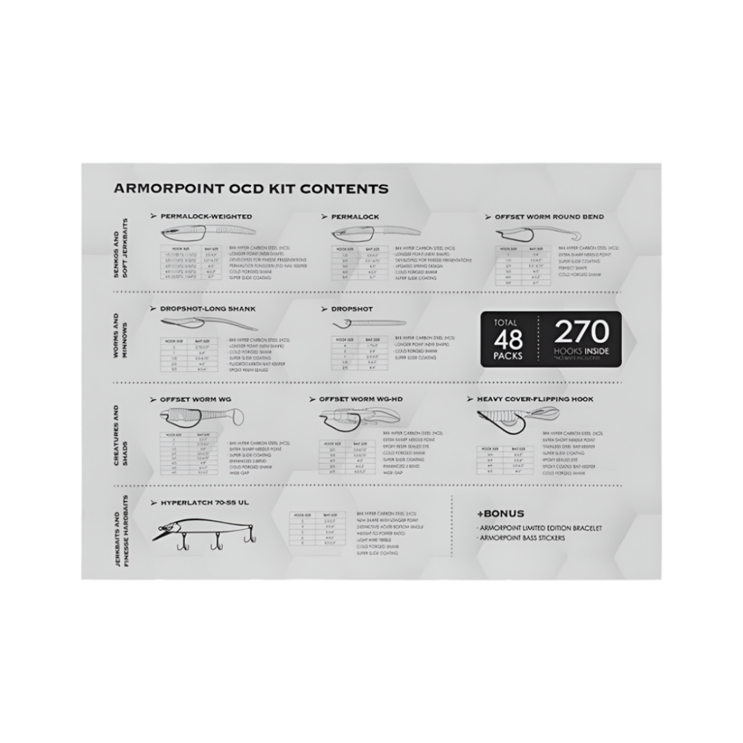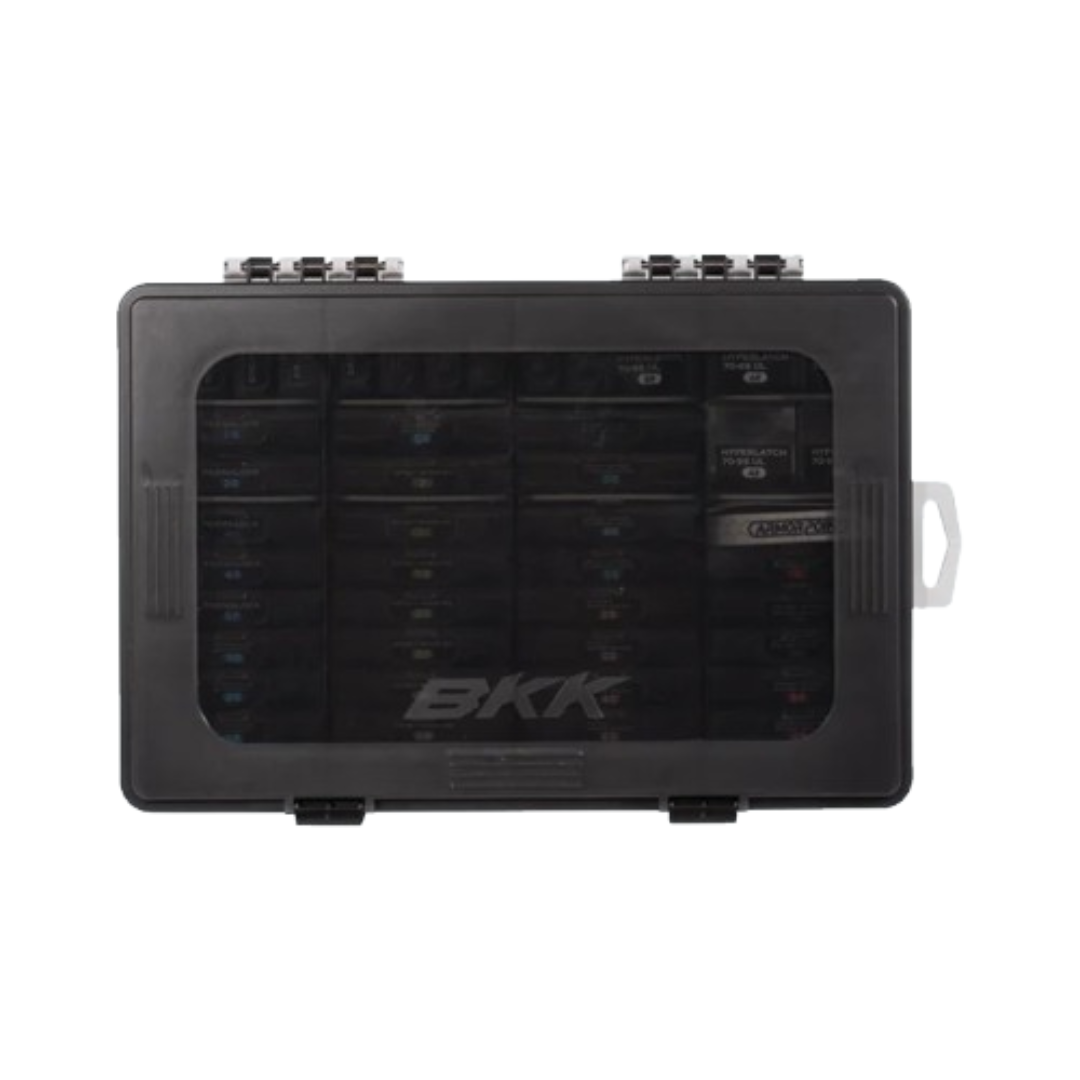 BKK OCD Tackle Storage System Fully Loaded Pre-loaded with 48 different Armor Point hooks and storage boxes, the BKK OCD Tackle Storage System Fully Loaded provides anglers with a one-stop tackle solution for a wide range of conditions and applications. An optimized containment device for BKK Armor Point hooks or fishing accessories, the OCD tackle storage system uses a front and side labelling system that allows you to instantly identify the contents for quick and effortless tackle selection Designed with unique compartments to hold Armor Point Hook Accessory boxes or the original backer card box, this fully adjustable storage box allows anglers to customize up to 80 small boxes, 44 medium boxes, or any combination in between. Built from a heavy-duty polypropylene material for improved durability, the soft waterproof gasket and strong latches for a watertight seal to keep the moisture out. The ultimate companion for keeping hooks and terminal tackle organized and easy to locate, the BKK OCD Tackle Storage System Fully Loaded is made to save the obsessive and compulsive tournament angler time and money. Β β Optimized for use with Armor Point Hook Storage Boxes β Customizable Layout β Heavy-duty Polypropylene Construction β Soft Waterproof Gasket Β Dimensions: 13β x 8.59β x 2.56β Β Includes: β (1) BKK OCD Tackle Storage Box β (48) Pre-loaded Armor Point BKK Hook Storage Accessory boxes β (2) BKK OCD Armor Point Hook and Accessory Box