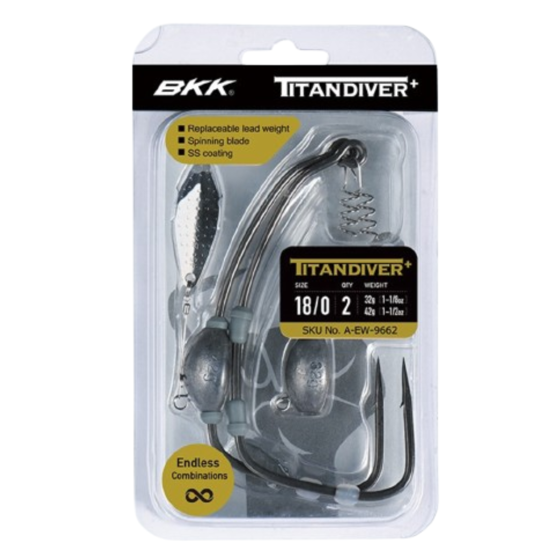 The BKK Titan Diver+ is the ultimate evolution of the Titan series. Potentially a breakthrough in the worm hook segments, the Diver+ inherits all the features of an ordinary Titan hook – Super Slide coating, needle point, spring and silicon stopper – enhanced with a simple, intuitive and effective lead-swapping system. The system offers many different combinations to add weight to your lure as the lead can slide on the shank, stimulating the creativity of anglers in adapting it to various fishing techniques and conditions. The bottom eyelet on the weight allows for the addition of a blade to enhance the presentation of the lure. The hook comes equipped with different leads in the package, please refer to the table below.