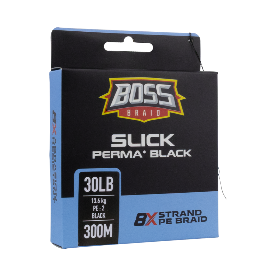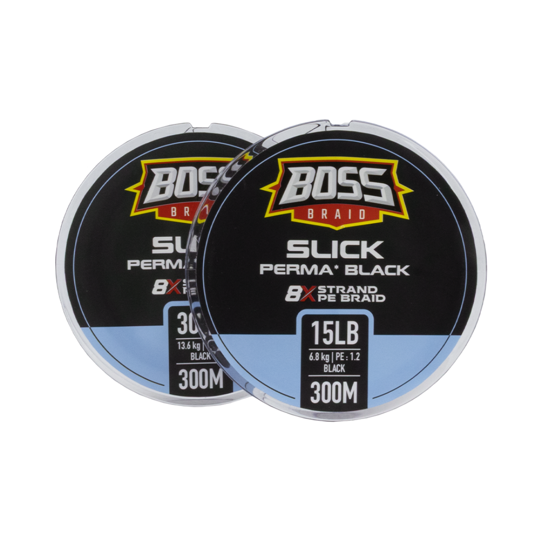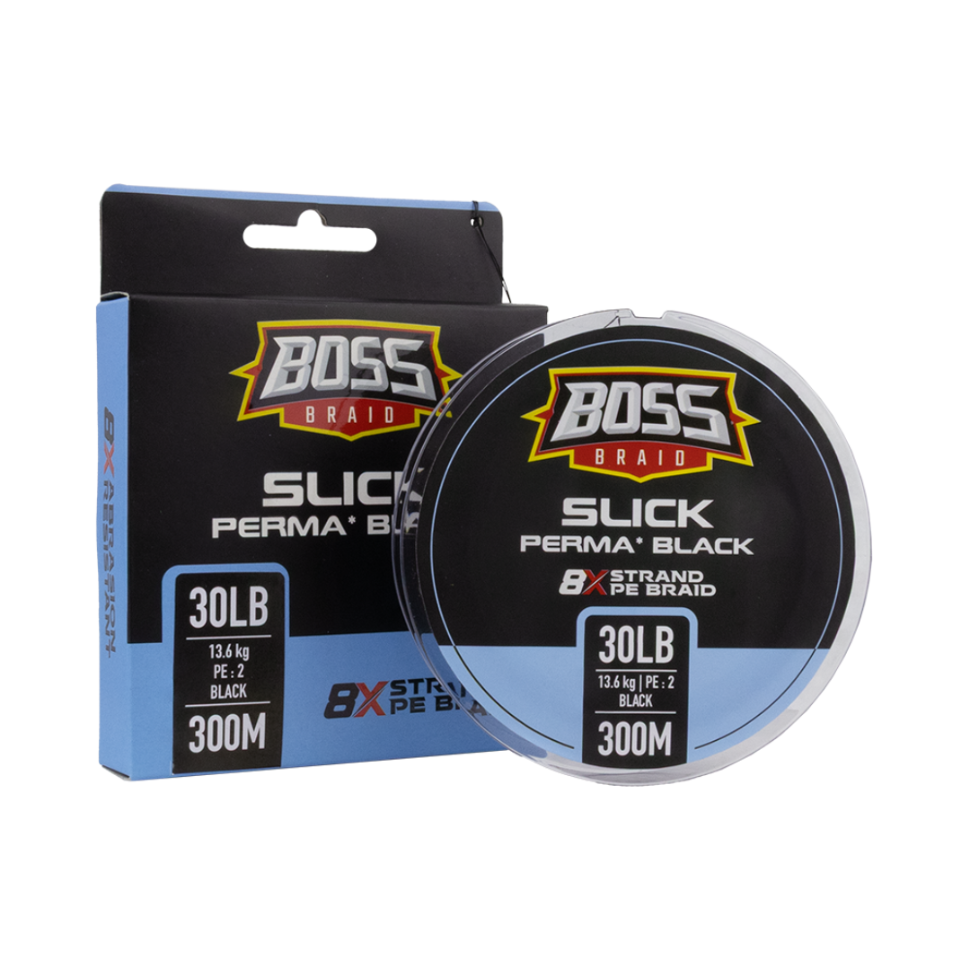 Anglers asked, and we listened. Boss Braid Slick is now available in Perma* Black, retaining its colour throughout its lifespan. In saltwater, Black provides high visibility to track your line, while in freshwater, it adds a layer of stealth. Manufactured from premium, black PERMA PE fibers that aren’t dyed, it undergoes a specialized Teflon surface coating process delivering smoother, low-resistance casts with superior knot strength. The 8-strand construction delivers exceptional durability, offering eight times greater abrasion resistance. Available in 300m & 600m spools (10lb - 80lb breaking strains), now with PE ratings to match rod systems. Find them at your nearest Boss Braid Stockist.